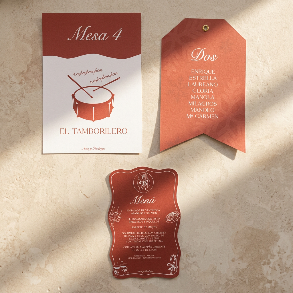 Minutas, marcasitios, meseros, seating plan y todos los detalles gráficos adaptados a vuestra temática y estilo.