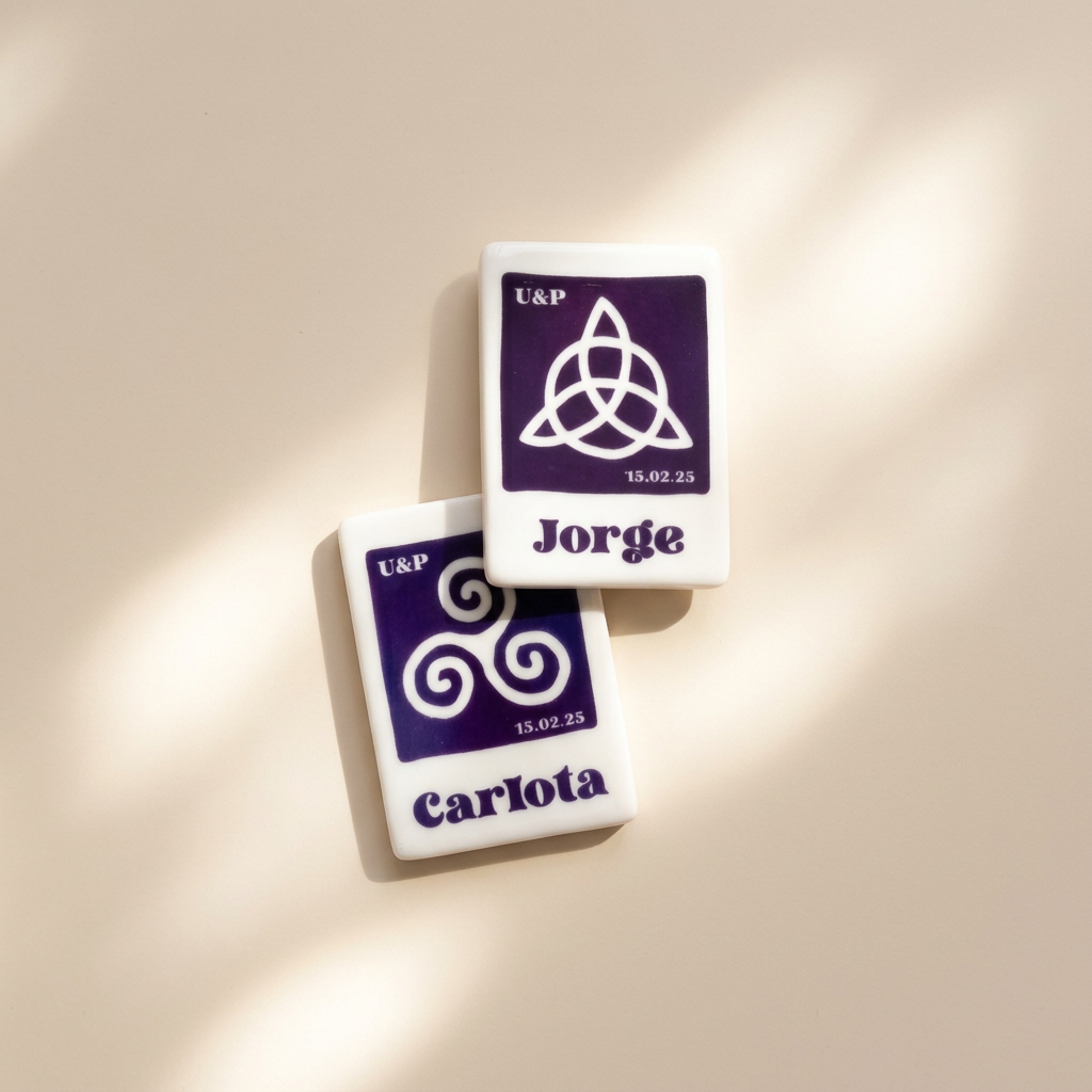 Ambos son de Galicia y querían tener un guiño con sus orígenes. Por eso, preparamos cuatro diseños diferentes con distintos símbolos celtas en honor a su tierriña.