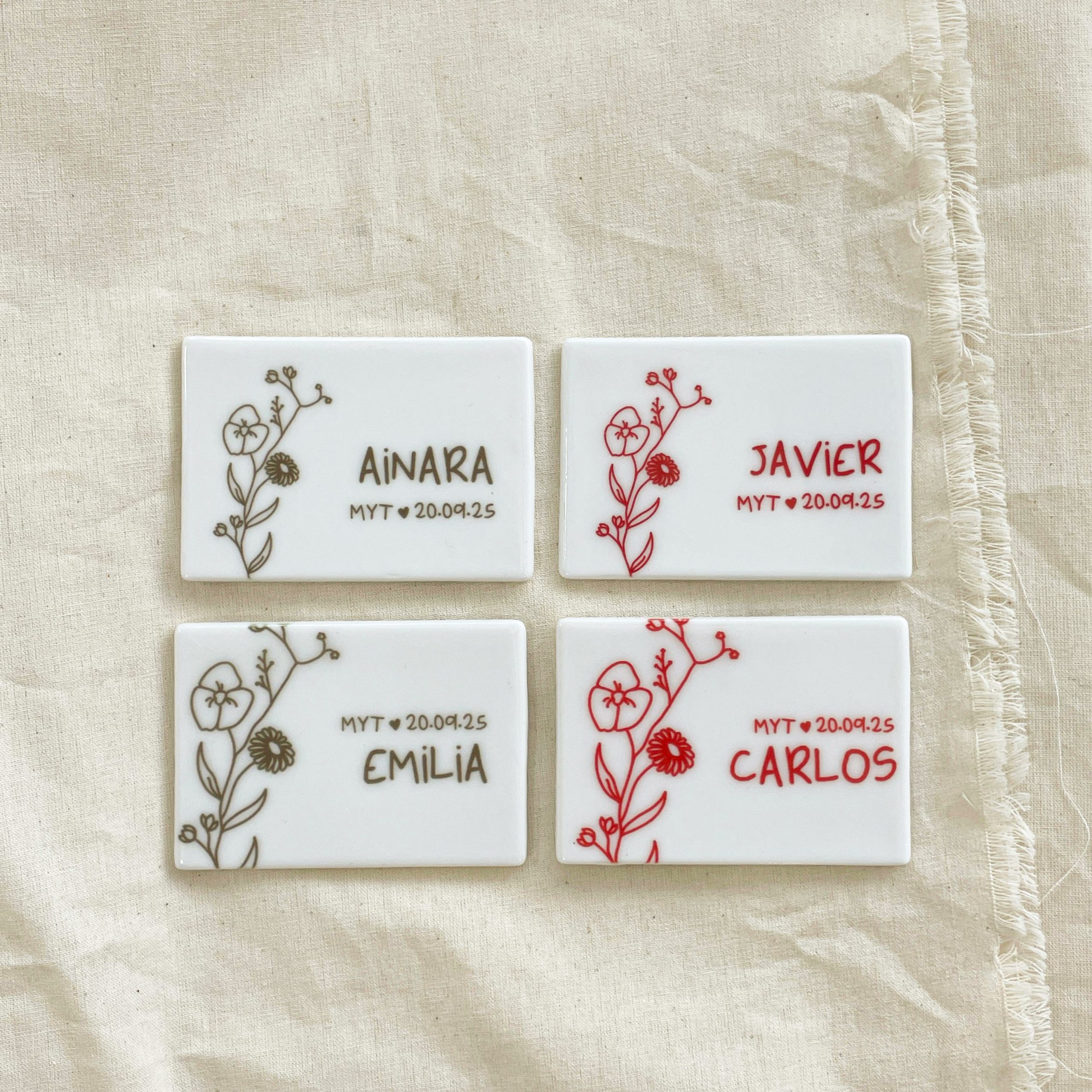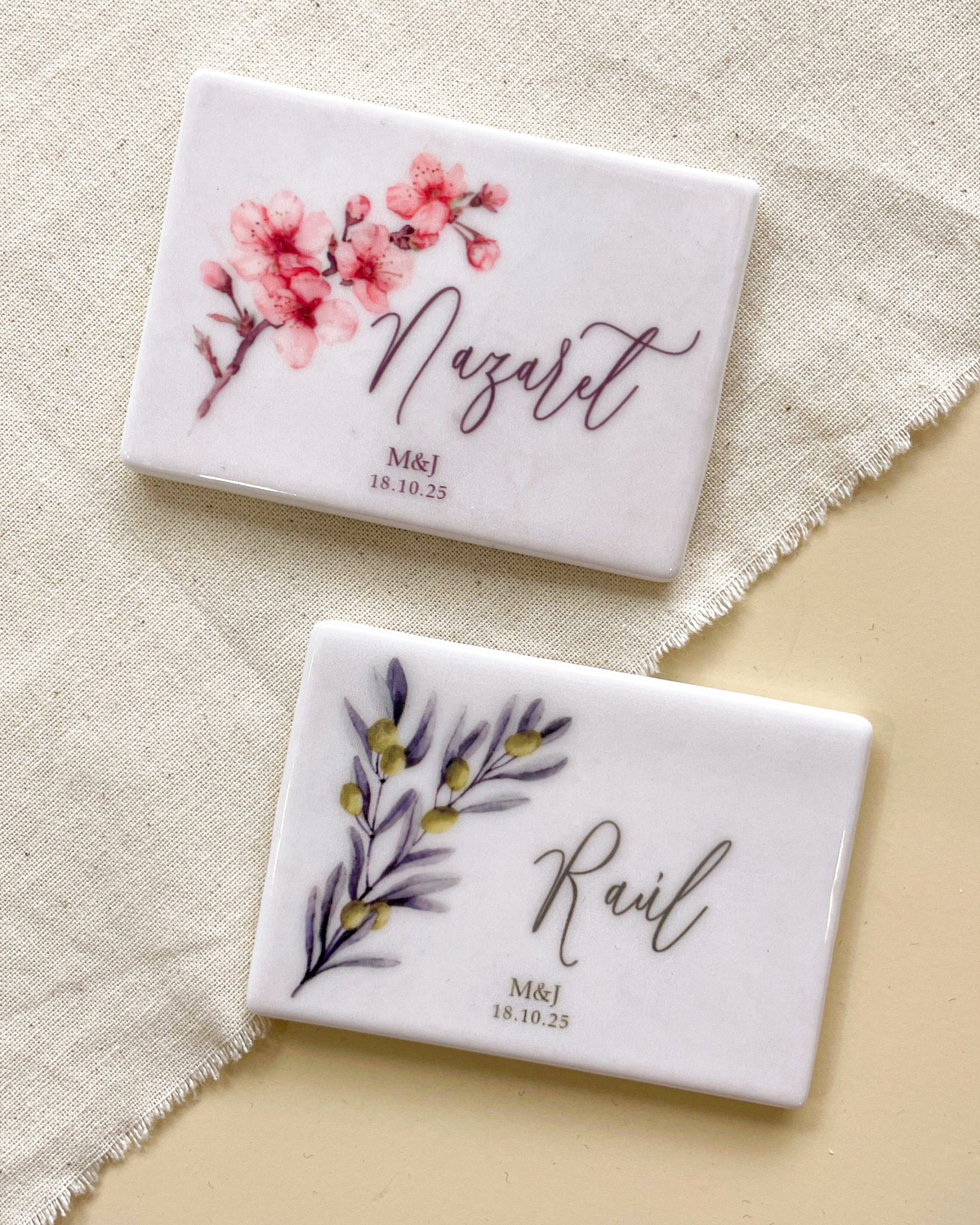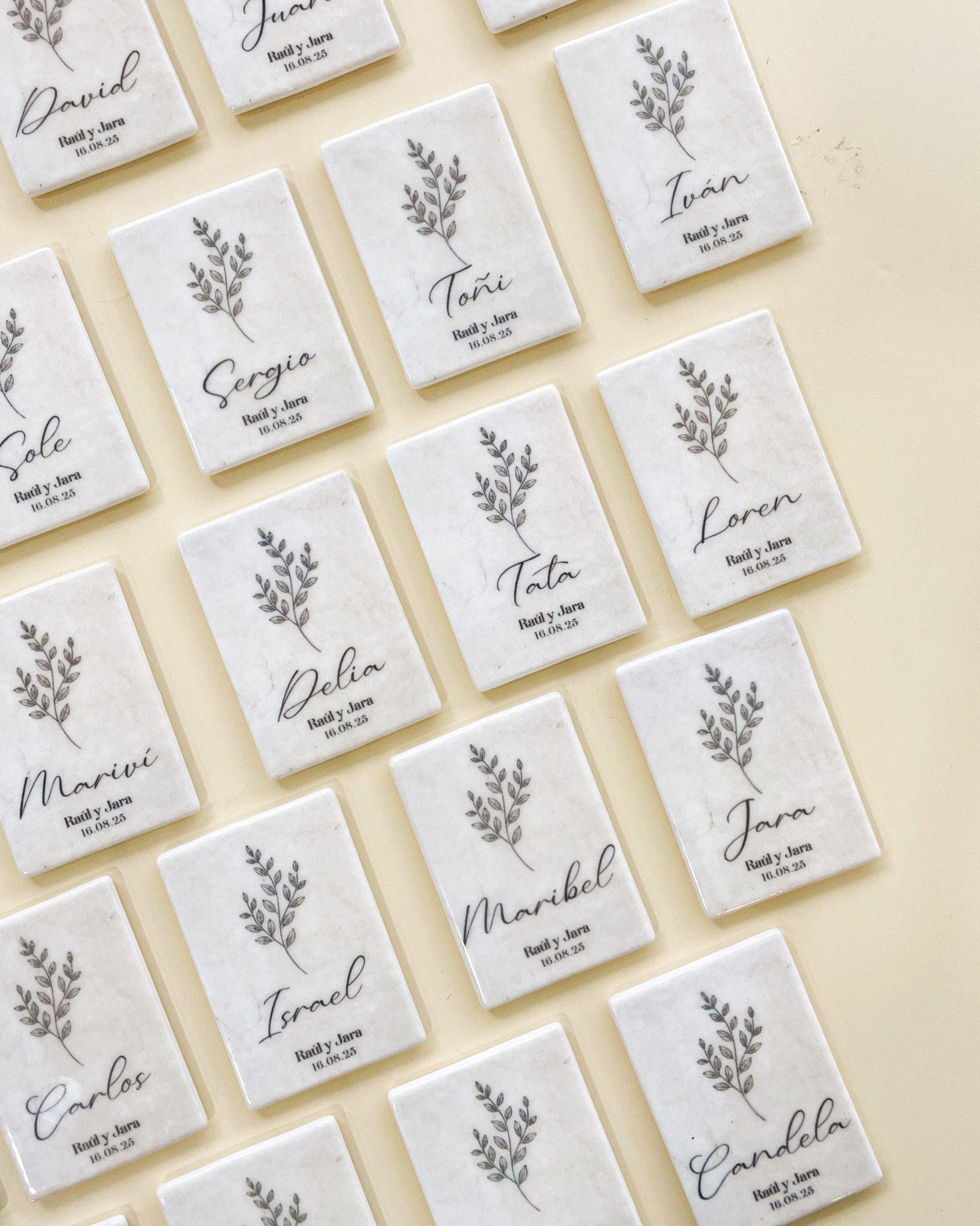 Si buscas una forma diferente con la que indicar a cada invitado su lugar en la mesa durante el banquete, estos marcasitios te encantarán. Se tratan de unos imanes de cerámica que podrás personalizar con su nombre, así como con vuestras iniciales y la fecha de la boda. No solo servirá para señalar el lugar de cada uno en la mesa, sino también para llevarse a casa de recuerdo de un día tan especial ya que la parte trasera incluye un imán.