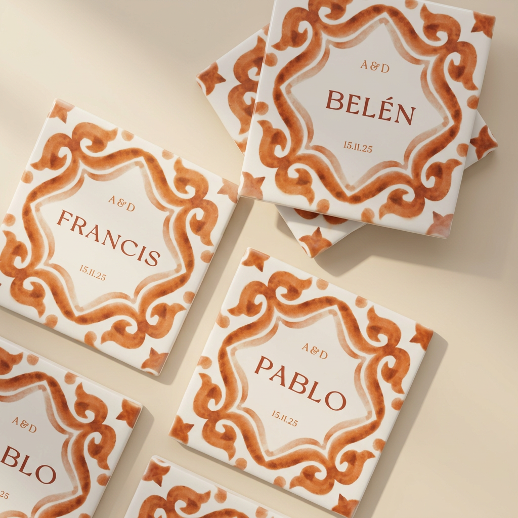 Posavasos de cerámica personalizados con nombre. La pieza perfecta para aunar la idea de marcasitio con un detalle que cada invitado pueda llevarse a casa como recuerdo de un día único.