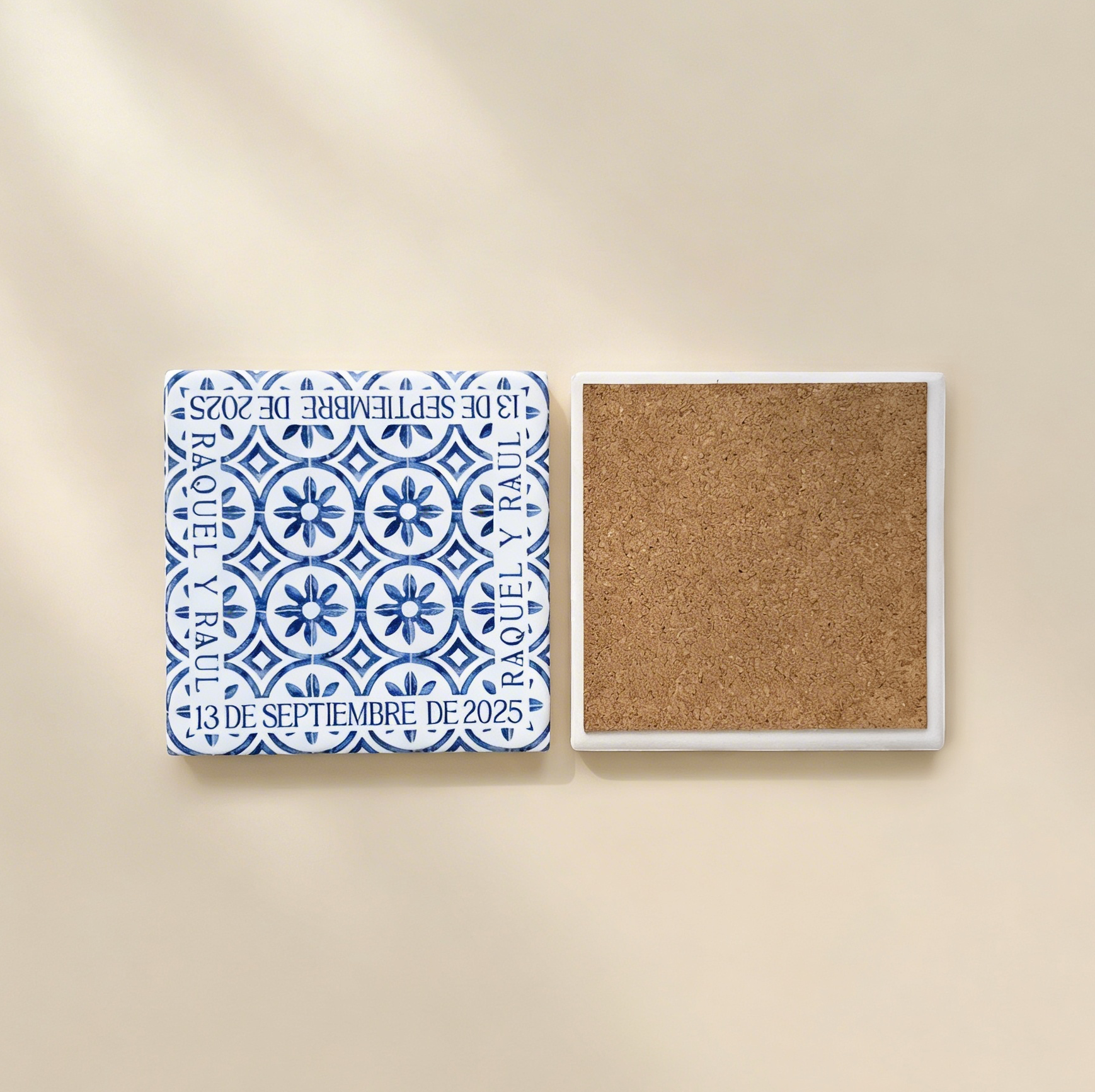 Con un formato cuadrado de 10×10 y base de corcho, estos posavasos no solo acompañan la decoración del evento, sino que se transforman después en un recuerdo duradero. Un pequeño objeto que vuestros invitados podrán llevarse a casa y conservar en su día a día.