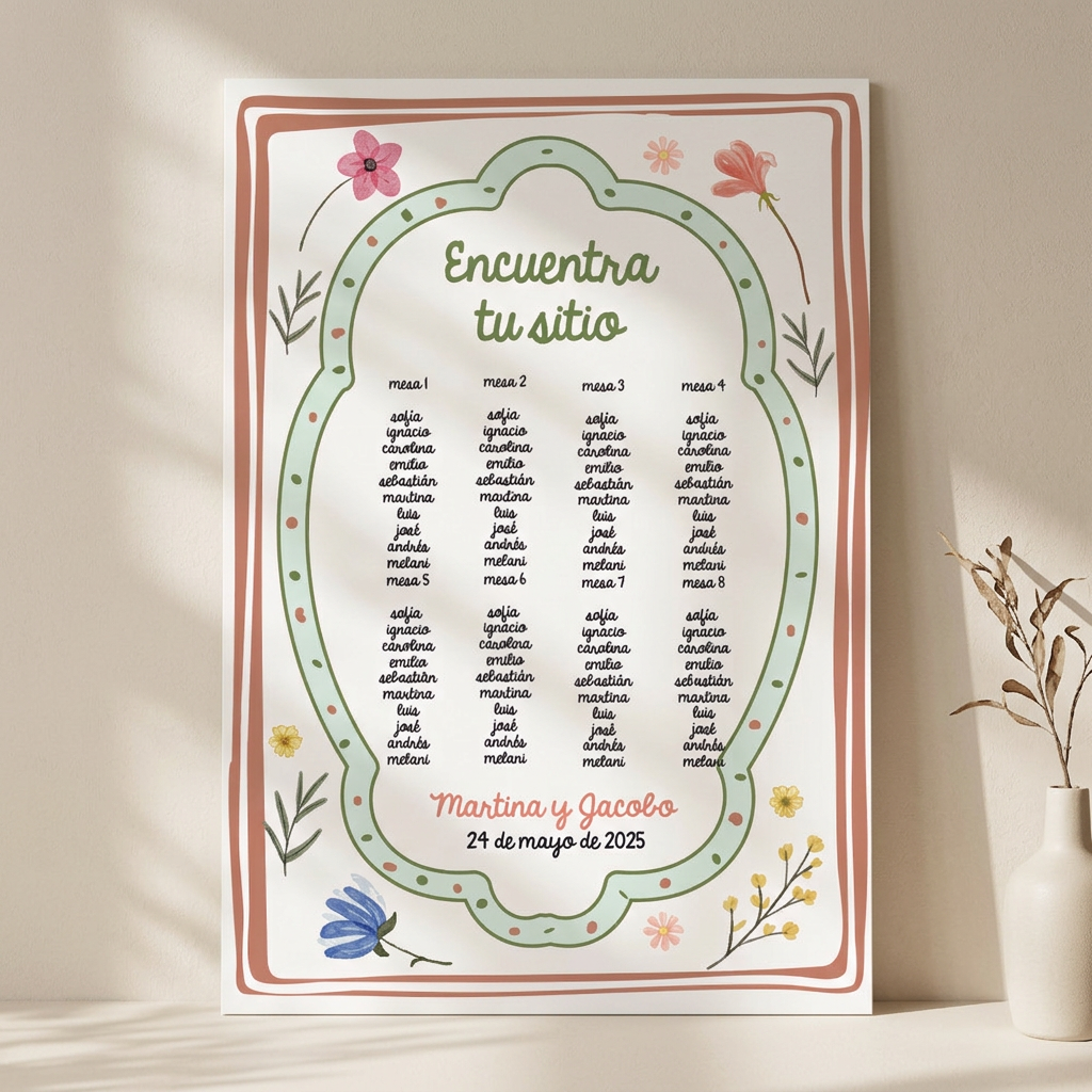 Una vez realizado el pedido, te enviaré una plantilla de Excel para que rellenes con el orden de las mesas. Antes de imprimir, te enviaré una muestra para que veas cómo va a quedar y me des el visto bueno. Si tienes más de 15 mesas, es posible que tengamos que hacer el cartel más grande para que todo cuadre bien (esto puede incrementar el precio).