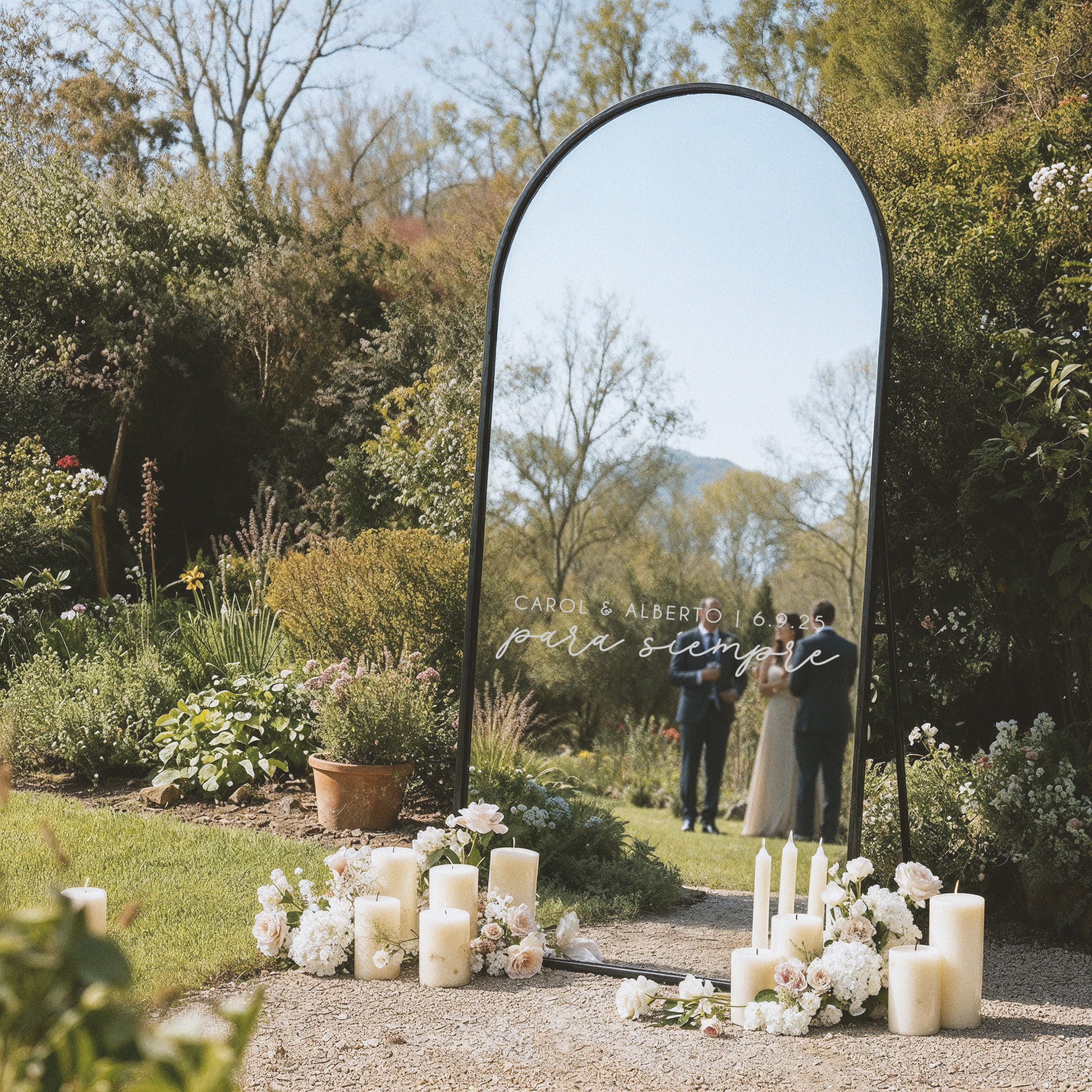 Si quieres dar un toque diferente y original a la decoración de tu boda, esta opción te encantará. Se trata de un vinilo adhesivo personalizado con la frase «para siempre» en letra manuscrita, junto a vuestros nombres y la fecha de la boda.